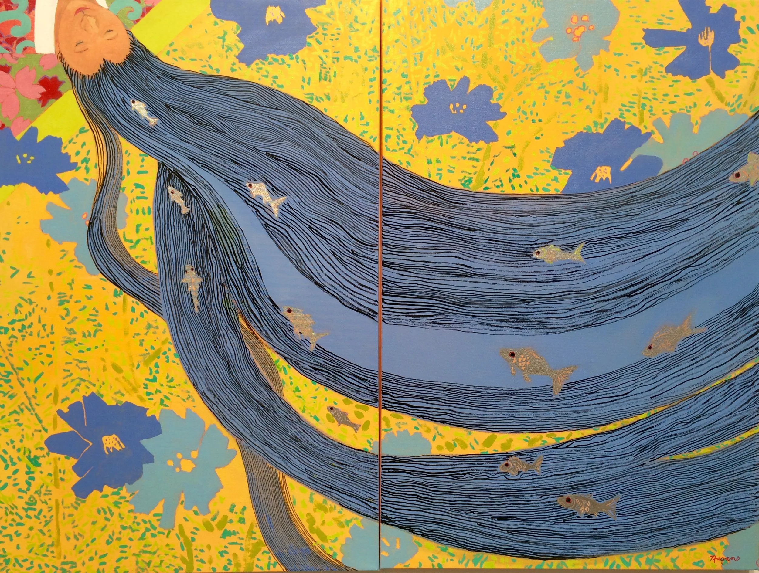 Approaching my life and work from a different angle inspired a painting long in gestation: A diptych titled Dreams Like Silver Fish which was inspired by a poem I wrote after a visit to Beppu, Japan. It also inspired me to bring Lady M into the realm of Hungry Ghosts for the first time. (Lady M & Hungry Ghosts, mixed mediums, 24 x 24”)